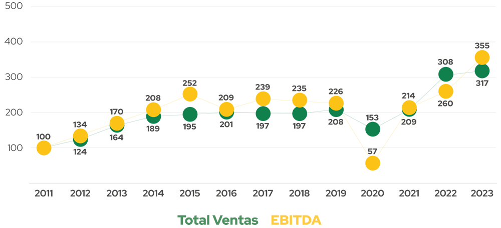 En este contexto, nuestro compromiso y estrategia está enfocada en el crecimiento rentable de nuestros negocios, a través de la generación de valor para nuestros clientes y otros grupos de interés. Logramos un sólido desempeño alcanzando un crecimiento en el EBITDA del 23%, reflejando de esta manera nuestra capacidad de generar valor de manera sostenible en entornos cada vez más complejos, volátiles e inciertos.